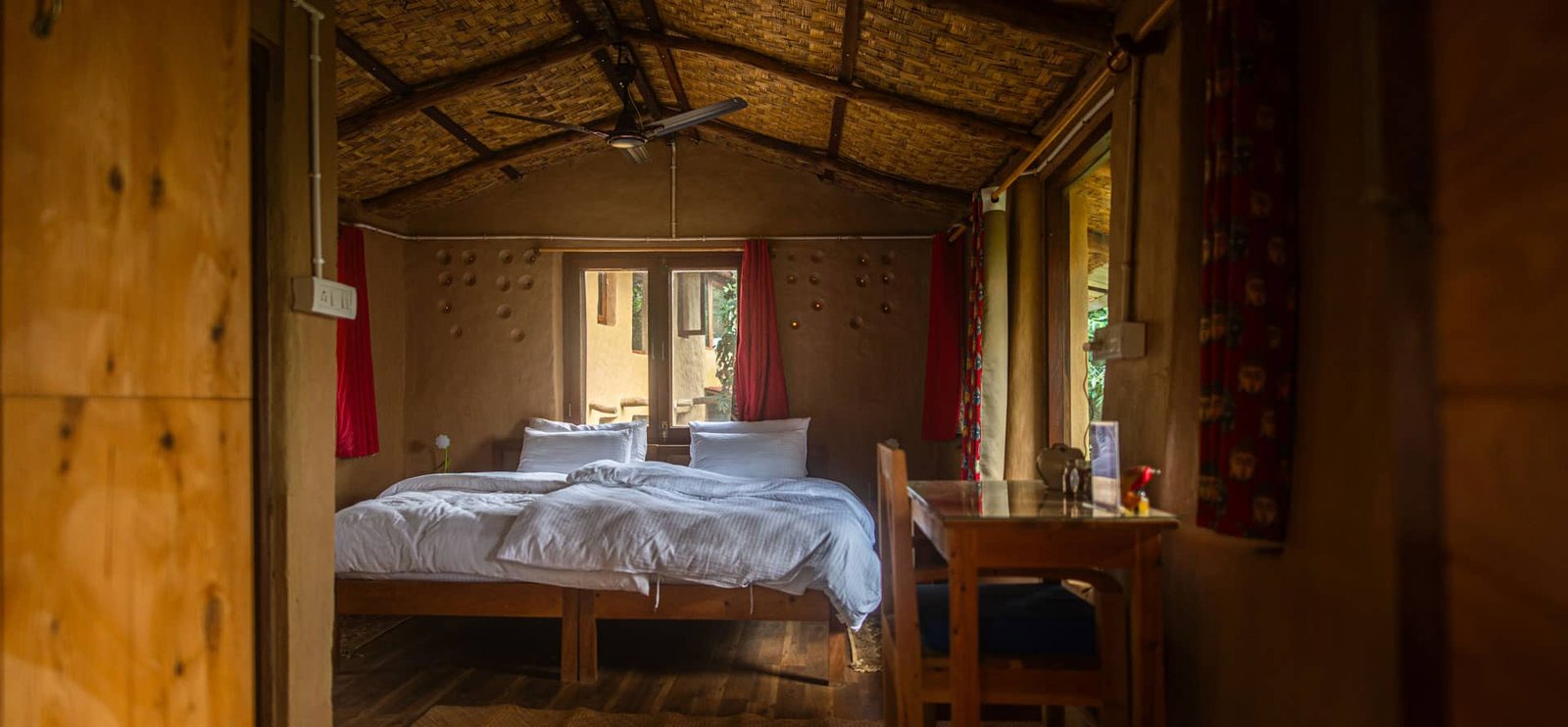 Each charming, eco-friendly cob suites has two rooms, a private bathroom, and can comfortably sleep three adults. Each suite also has a large plate glass bay window surrounded by lush green nature and the distant mountains that serenade the soul to sink deeper into silence and contemplation. They exude a rustic charm and are preferred by many guests for the sense of groundedness they offer.